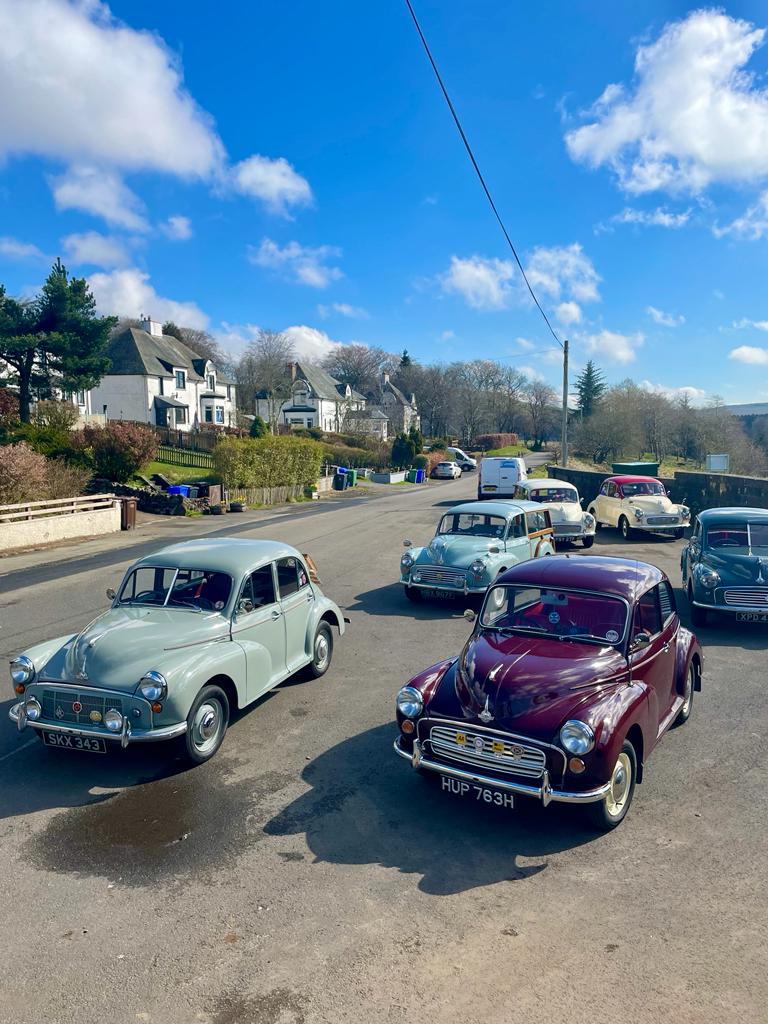 Six Moggies met in Milngavie before setting out for a forty mile Morris Minor adventure in the glorious sunshine. There would have been more Moggies in attendance, but for one or two not quite passing the “leaving the garage” shakedown test!