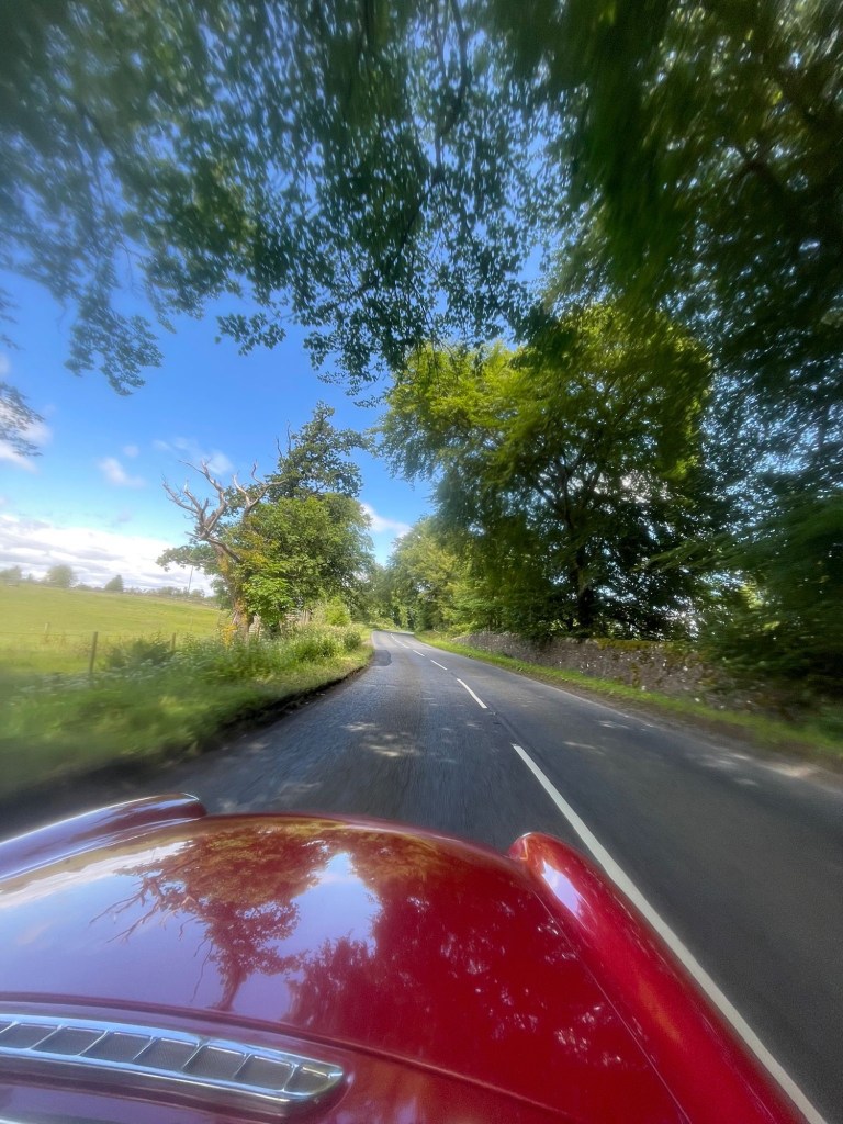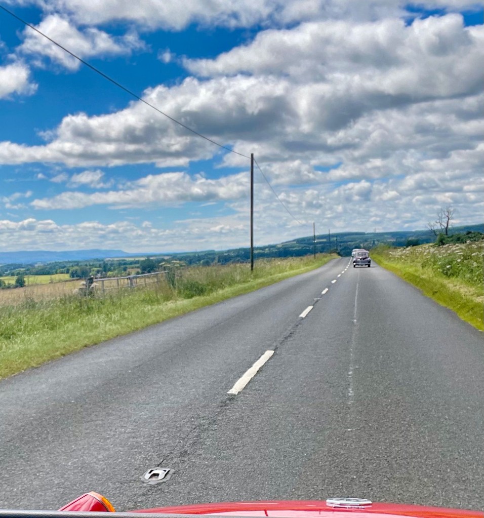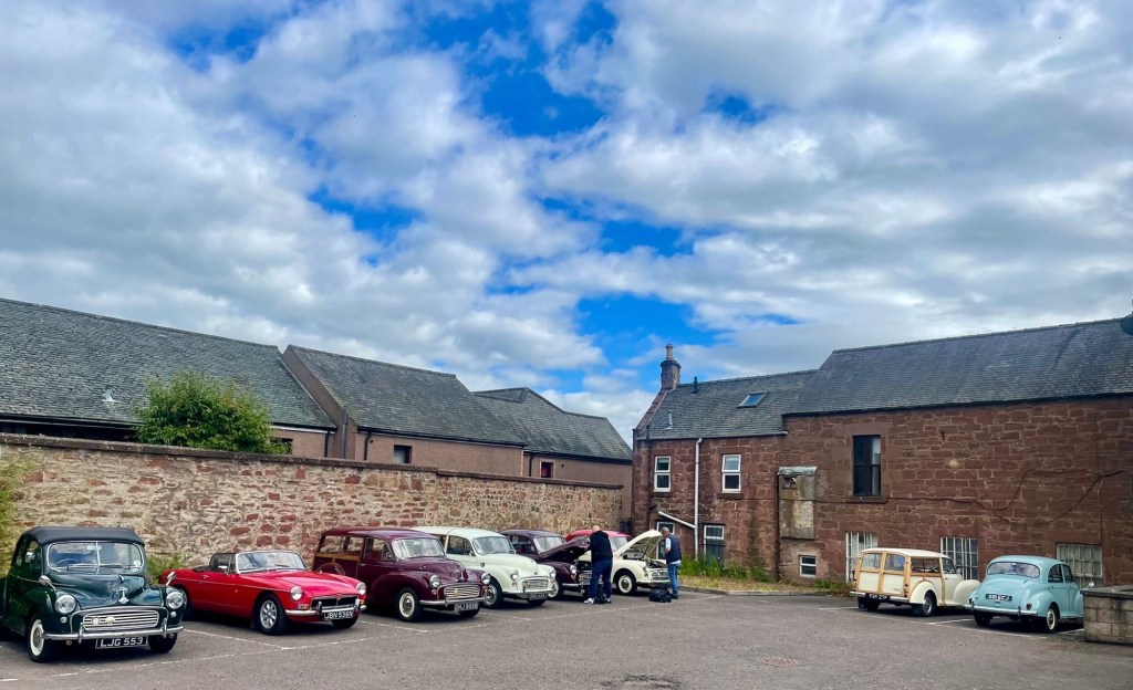 Eight Glasgow Moggies cars set off from Dunblane around 1pm on Friday 12th July for the sixty mile scenic drive through Perthshire to Kirriemuir. Apart from a Google maps detour through Crieff high street and carpark all went well!